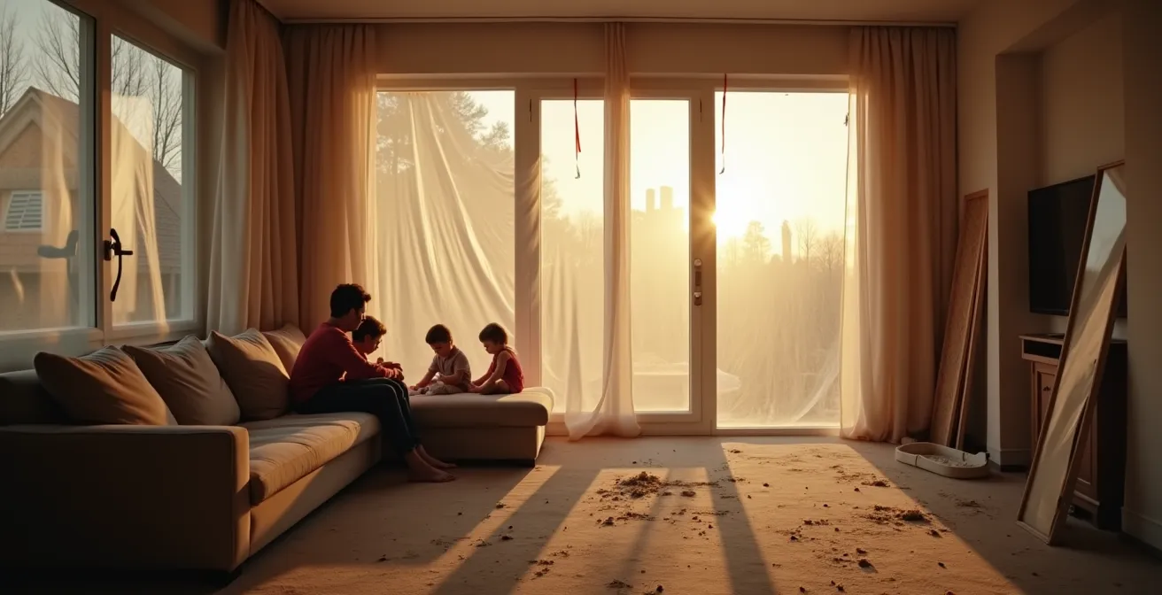 La poussière de plâtre est l’ennemi public numéro un d’un chantier habité. Fine, volatile et abrasive, elle s’infiltre partout, contamine l’air que vous respirez et peut provoquer des allergies ou des problèmes respiratoires, particulièrement chez les enfants. La simple bâche en plastique scotchée à la va-vite est une illusion de protection. Pour construire la première muraille de votre « forteresse familiale », vous devez créer des zones hermétiques en appliquant des techniques professionnelles de confinement.
